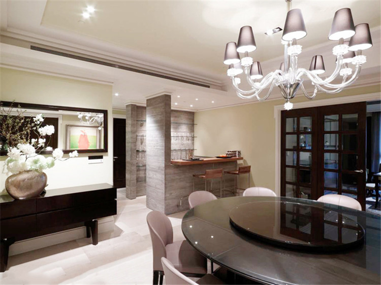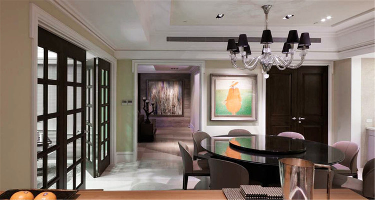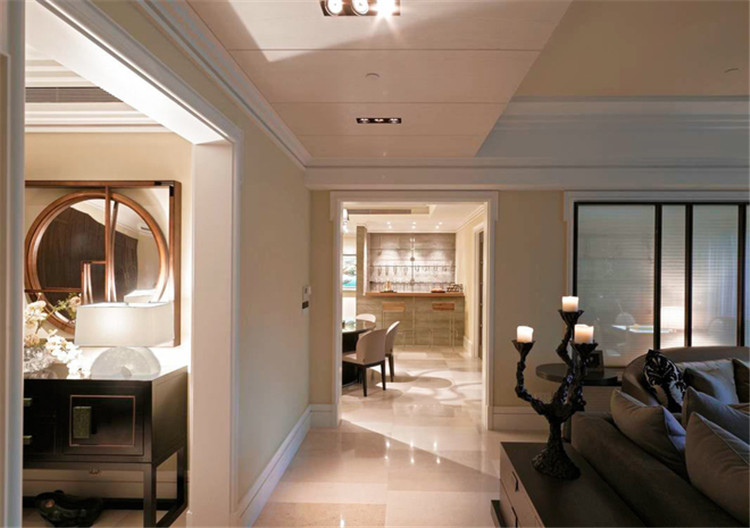 客厅房门正对餐厅吧台,也让空间有装饰感,如果没有设计吧台,也可以用其他装饰物品来处理这一块墙面,避免空间通道一眼看过去没有装饰物品显得单调。