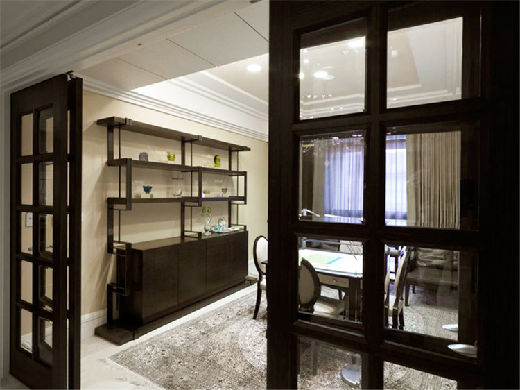 成都别墅装修公司利用一个小空间做了一个休息室,朋友聚会或是较为正式的场合都可以使用。墙边使用了一个装饰柜,摆放一些藏品以展示房主的品味。房间门使用平开玻璃门,增加空间视野,不会因空间问题显得狭窄。