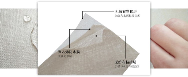 采用聚乙烯、高强丙(涤)纶无纺布、紫外线隔光剂、抗老化剂等高分子原料,卷材中间层是防水层和抗老化层,上下两面是增强粘结层,牢固、可靠、无翘边、无空鼓,双层防水,是一种新型的防水材料。
