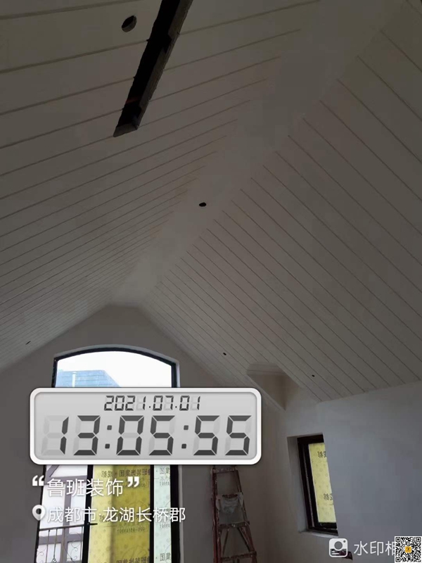 人字形顶面造型,采用轻钢龙骨和欧松板做好基层,外面再运用业主自己喜欢的木材。