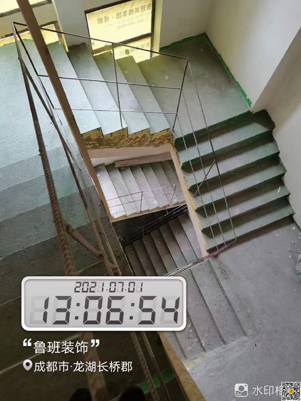 装修现场成都鲁班装饰公司要求安全第一,楼梯没有安装完成之前都会用钢筋做好临时护栏